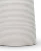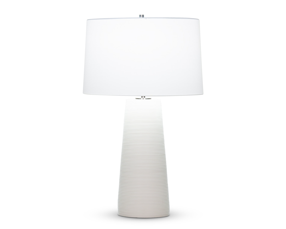 Contemporary meets casual in this stylish table lamp which sports a matte white finish with a finely ribbed surface to provide some texture and visual detail. A off-white cotton tapered drum shade completes the look. Place this lamp in an eclectic interior for the perfect finishing touch.