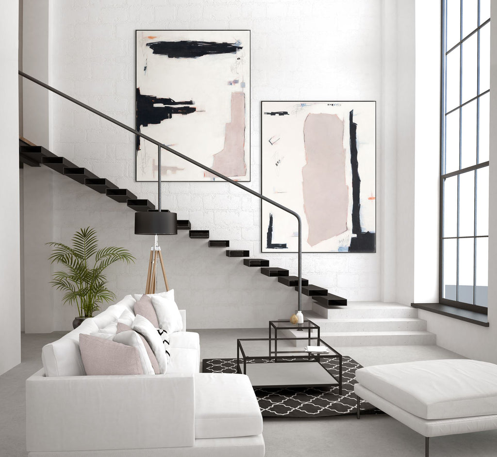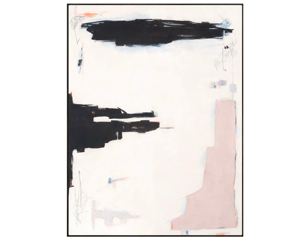 Subtle layers of soft pastel colour surround energetic lines and strong black shapes in these mid-century style abstracts. In a dark wood floater frame.